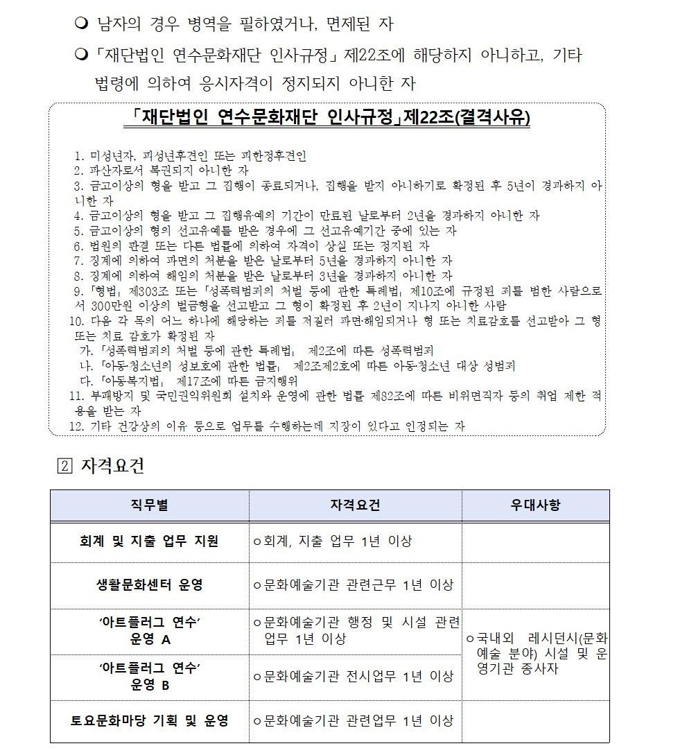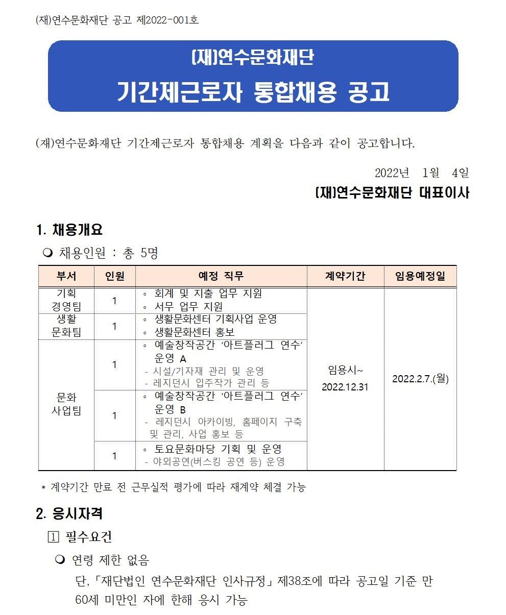 (재)연수문화재단 기간제근로자 통합채용 공고