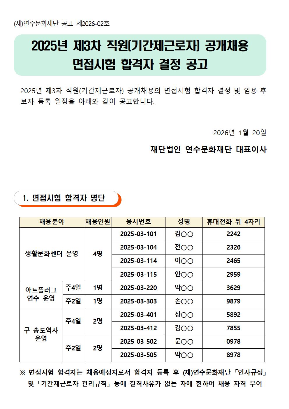 [제2026-02호] 2025년 제3차 직원(기간제근로자) 공개채용 면접시험 합격자 결정 공고