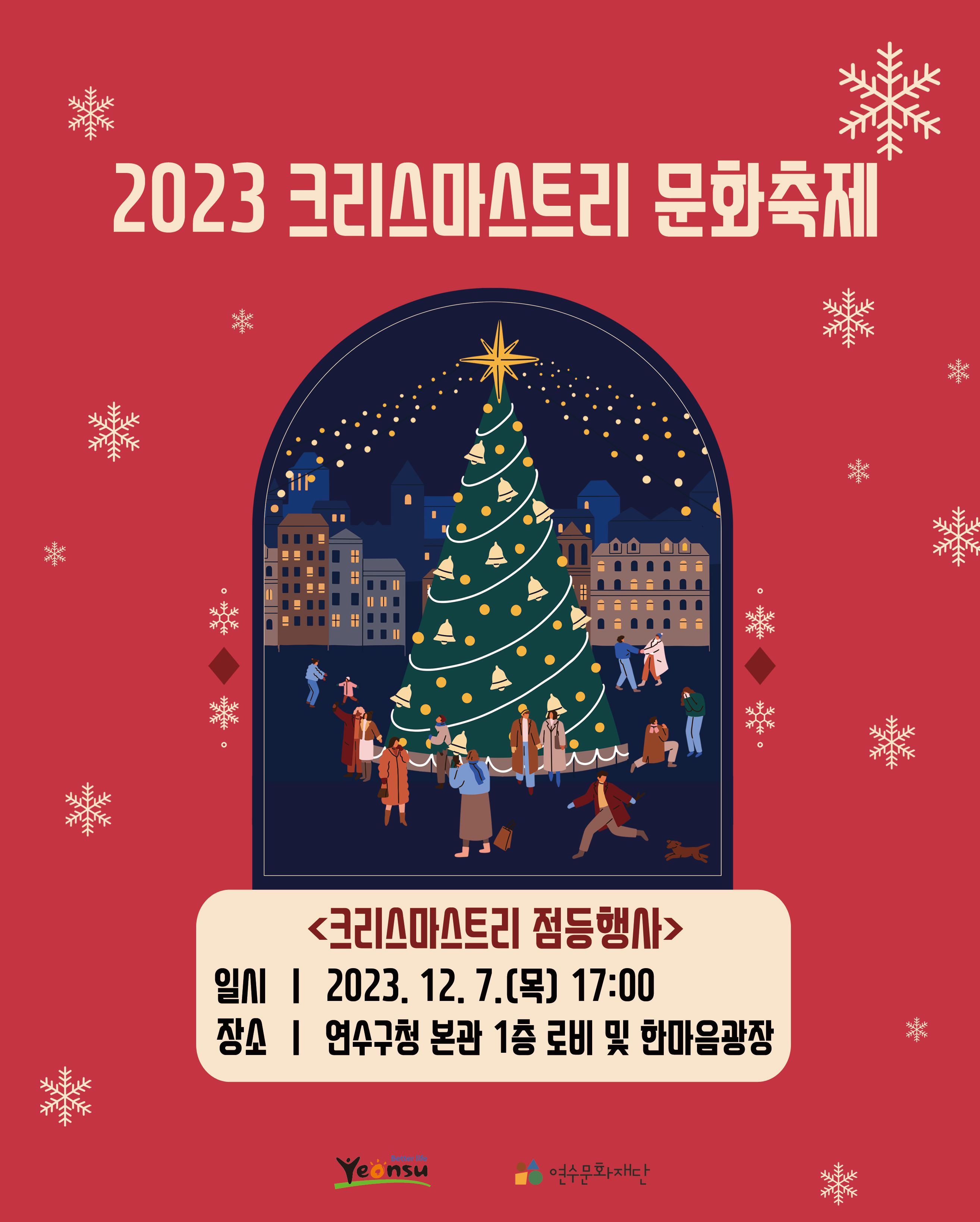 ○ 일시 : 2023-12-7(목) 17:00~18:00 ○ 장소 : 연수구청 한마음광장 ○ 주요내용 : 크리스마스트리 점등식, 업사이클링 크리스마스트리 설치전시, 축하공연 등 ○ 주관 : 연수구, 연수문화재단